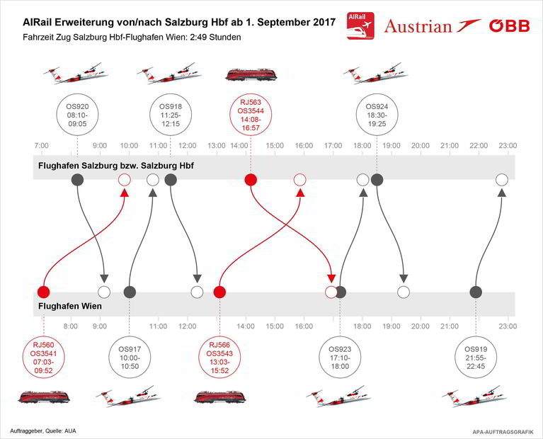 La aerolínea de bandera austriaca Austrian Airlines y la empresa de transporte ferroviario austriaca ÖBB (Austrian Federal Railways) continúan su colaboración ofreciendo a partir del próximo 1 de septiembre de 2017 una conexión ferroviaria entre el Aeropuerto Internacional de Viena y Salzburgo.
