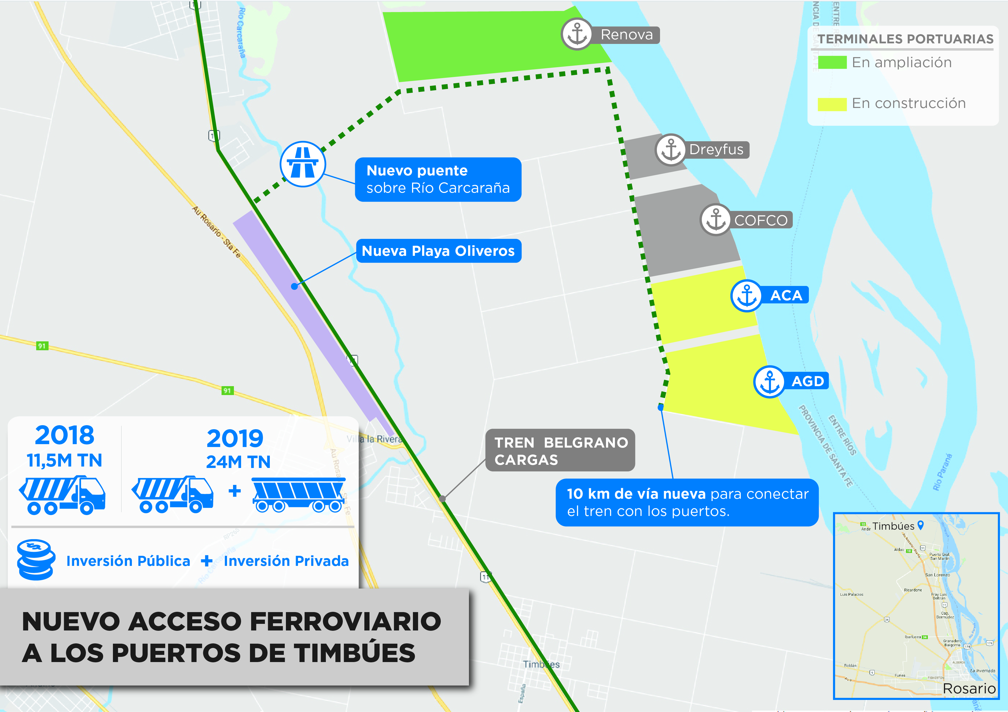 La inversión total destinada a esta obra asciende a $4.260 millones y generará más de 500 puestos de trabajo. Mientras que el gobierno nacional se ocupa de construir la infraestructura de la nueva playa y puente ferroviario, las terminales de ACA, AGD, COFCO, LDC y Renova estarán a cargo de la construcción de las vías de acceso a cada terminal. Las nuevas obras ferroviarias acompañan la construcción actual de dos nuevas terminales (ACA y AGD) y la reciente ampliación de Renova que permitió incrementar 50% su capacidad de despacho.