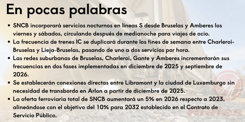 El operador belga incrementará su oferta un 2% en 2026 con nuevos trenes después de medianoche los fines de semana, duplicará frecuencias interurbanas y reforzará las redes de cercanías en cuatro núcleos metropolitanos principales.