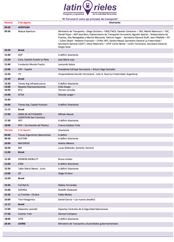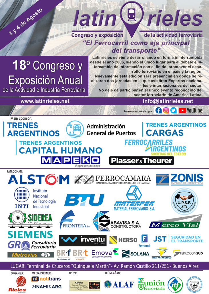 C.A.B.A. – 17/07/2023: Durante los días 3 y 4 de agosto se realizará el 18° del Congreso y Exposición de la Actividad e Industria Ferroviaria “Latinrieles 2023 – El Ferrocarril como Eje Principal del Transporte”; desarrollandose el mismo en la Terminal de Cruceros Quinquela Martín de la Ciudad de Buenos Aires.
