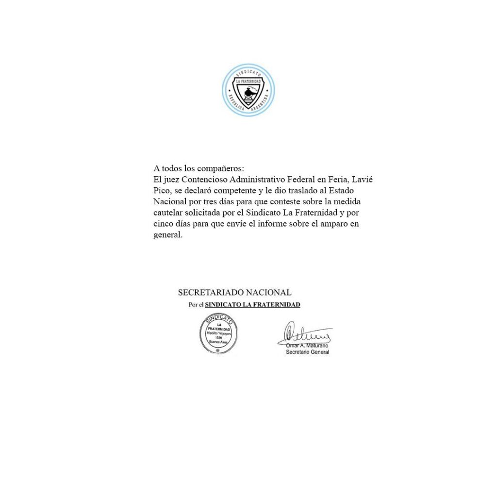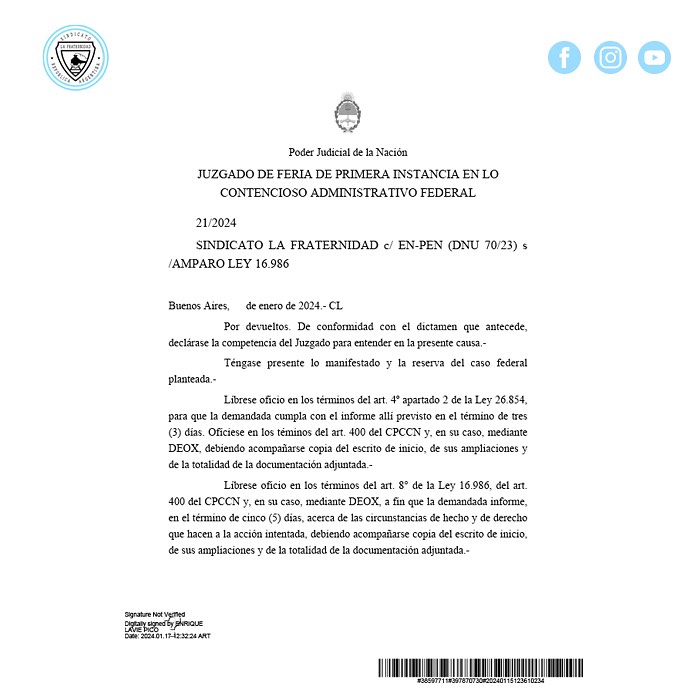 C.A.B.A – 18/01/2024: Como habiamos anticipado el pasado viernes sobre la presentación realizada por el Sindicato La Fraternidad, en rechazo al DNU 70/2023, durante la jornada de ayer el juez Contencioso Administrativo Federal en Feria, Lavié Pico, se declaró competente y le dio traslado al Estado Nacional por tres días para que conteste sobre la medida cautelar solicitada por el Sindicato y por cinco días para que envíe el informe sobre el amparo en general.