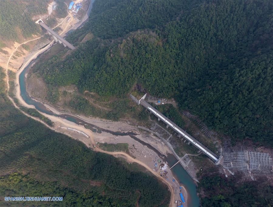 GUANGXI, septiembre 6, 2018 (Xinhua) — Imagen del 22 de enero de 2018 de un tren bala desplazándose a través del condado de Yongfu, en la Región Autónoma Zhuang de Guangxi, en el sur de China. El kilometraje total de las líneas ferroviarias en la Región Autónoma Zhuang de Guangxi ha alcanzado 5,191 kilómetros de 1,346.3 km en 1958. El ferrocarril se ha convertido en una arteria de transporte y trajo oportunidades económicas a Guangxi. (Xinhua/Lu Boan)