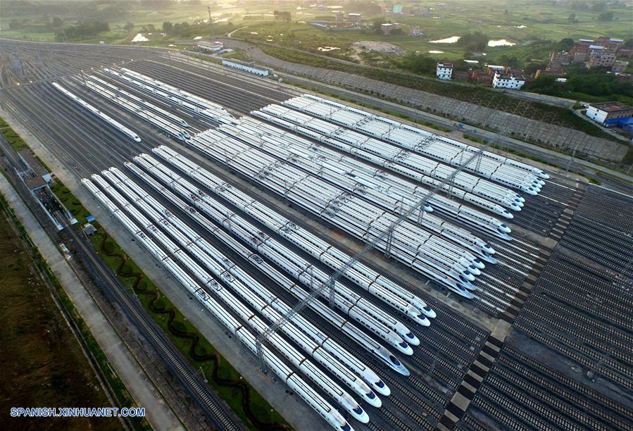GUANGXI, septiembre 6, 2018 (Xinhua) — Imagen del 17 de mayo de 2016 de una vista de los trenes bala estacionados, en Nanning, en la Región Autónoma Zhuang de Guangxi, en el sur de China. El kilometraje total de las líneas ferroviarias en la Región Autónoma Zhuang de Guangxi ha alcanzado 5,191 kilómetros de 1,346.3 km en 1958. El ferrocarril se ha convertido en una arteria de transporte y trajo oportunidades económicas a Guangxi. (Xinhua/Huang Xiaobang)