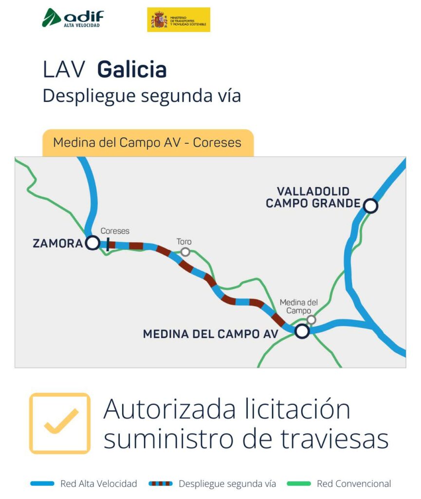 En este caso, el Consejo de Ministros autorizó a licitar, mediante Adif, el suministro de traviesas para el montaje de la segunda vía en el tramo Medina del Campo (Valladolid)-Bifurcación Coreses (Zamora) de la Línea de Alta Velocidad Madrid-Galicia. El contrato alcanza los 12,2 millones de euros, sin incluir IVA.
