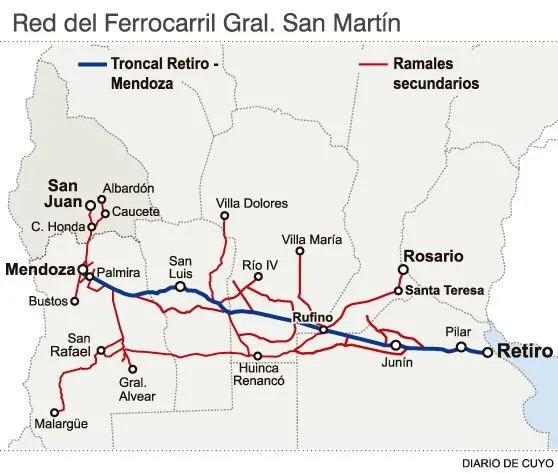 Partiendo de la ciudad de Villa Nueva (hoy Villa María), el estado argentino, comienza la construcción de la línea férrea que llegará a San Juan. En octubre de 1873, el ferrocarril llega a la ciudad de Río Cuarto; dos años después, en octubre de 1875 los rieles alcanzan la ciudad de Villa Mercedes. El día 7 de abril de 1885 el ferrocarril llega a Mendoza y cinco días después a San Juan. Luego de dos años, el Ferrocarril Andino era vendido y nacía de este modo el Ferrocarril Gran Oeste Argentino hasta el 28 de mayo de 1907 cuando pasa a ser administrado por el Ferrocarril Buenos Aires al Pacifico. El 1 de marzo de 1948, con la nacionalización de los ferrocarriles, el por entonces FC BAP pasa a denominarse Ferrocarril General San Martín.