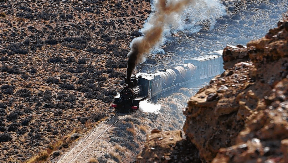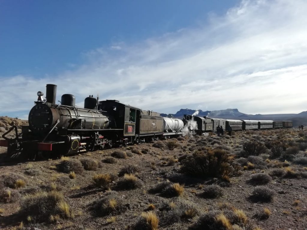 Río Negro – Argentina – 03/09/2019: El legendario tren a vapor volvió a atravesar la estepa patagónica. Los pasajeros fueron alemanes, ingleses, japoneses y neozelandeses, entre otras nacionalidades, en el viaje más largo de los últimos años: 127 kilómetros desde Jacobacci a la estación Cerro Mesa.