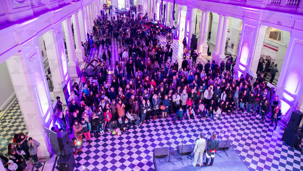 Los shows se desarrollaron en los escenarios montados en el hall del Pasaje, uno en el centro y los otros dos a cada lado. Detrás de los mismos, las pantallas gigantes exhibían fotos antiguas de esta construcción que tuvo diferentes usos a lo largo del tiempo. Nacida para ser la primera estación de trenes, inaugurada en 1887, esta construcción cumplió ese rol durante pocos años ya que en 1903 se trasladó el ferrocarril hacia 1 y 44. Tras 20 años de inactividad, el Pasaje fue remodelado para convertirse en lo que es hoy. Luego fue sede provisoria de diferentes reparticiones públicas. En 1944 comenzó a funcionar el correo hasta que tuvo su propio edificio. Después de eso, adoptó su configuración actual con el énfasis puesto en la cultura.