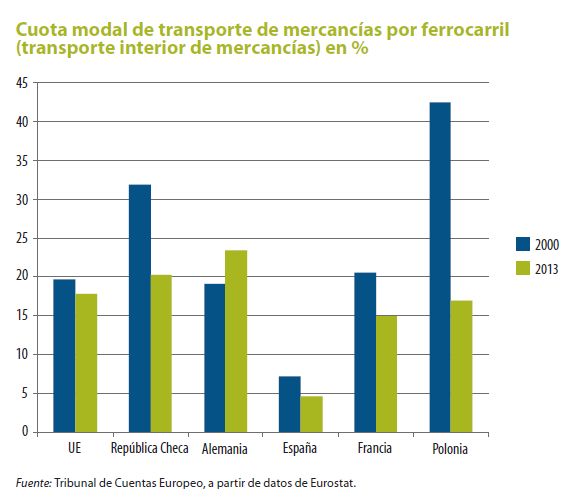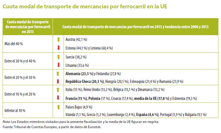 Pese al objetivo de la Comisión Europea de transferir el transporte de mercancías de la carretera al ferrocarril, la cuota del transporte de mercancías por ferrocarril en la Unión Europea ha sufrido un ligero descenso desde 2011, según un informe especial elaborado por el Tribunal de Cuentas Europeo titulado “Transporte de mercancías por ferrocarril en la UE: todavía no avanza por la buena vía”.