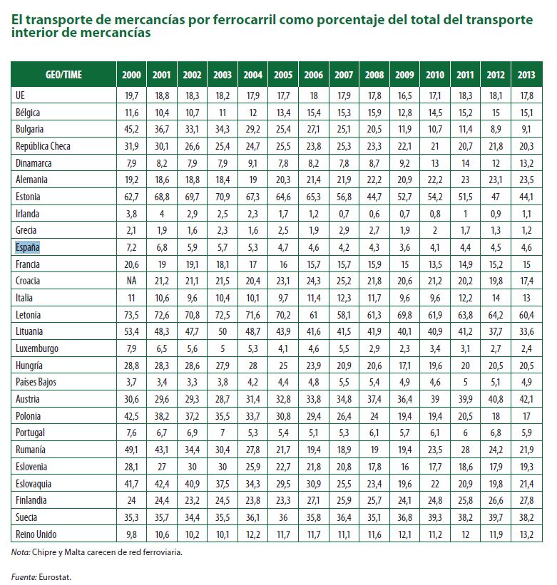 En dicho informe se afirma que el ferrocarril es más respetuoso con el medio ambiente y emplea menos petróleo importado, pero no está logrando superar la competencia del transporte por carretera.