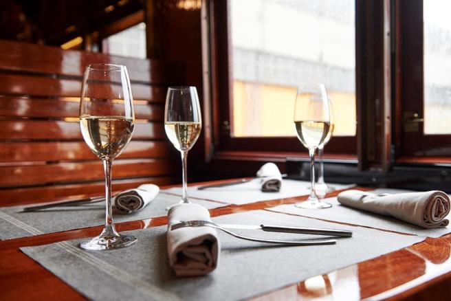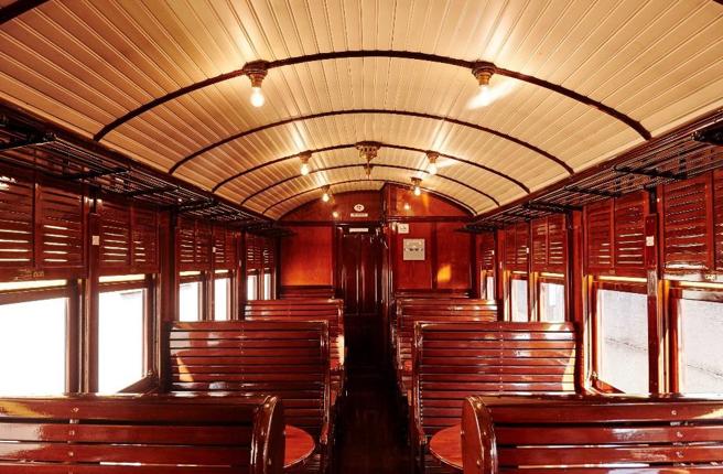 El tren está formado por cuatro coches restaurantes de finales del siglo XIX, con mesas y una barra de servicio de bar.