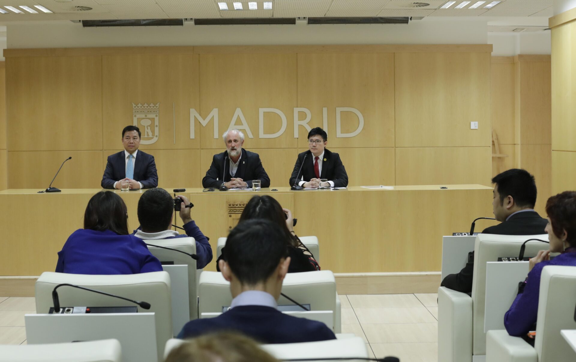 El coordinador general de Alcaldía, Luis Cueto, acompañado por el presidente de la Fundación para el Intercambio entre Yiwu y España, Mao Wenjin, y por el presidente del Overseas Chinese Service Center en Madrid, Mao Feng, ha presentado la Semana del Tren Madrid-Yiwu que va a tener lugar entre el 18 y el 25 de noviembre. Se trata de una semana cuyo objetivo es promocionar y dar a conocer el tren de mercancías que cubre los 13.000 kilómetros de distancia entre su origen en la ciudad comercial china de Yiwu, situada en la costa del Pacífico a 300 kilómetros al sur de Shanghái, y Madrid.