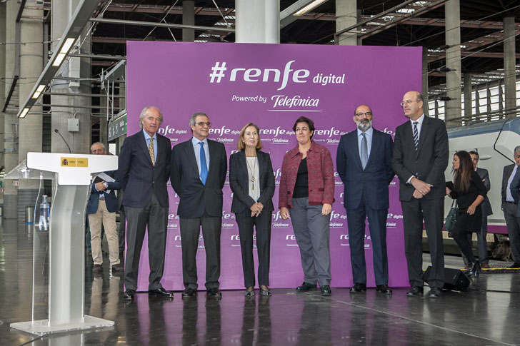 La ministra de Fomento, Ana Pastor, el presidente de Telefónica, César Alierta y el presidente de Renfe, Pablo Vázquez, han presentado en la estación de Atocha el primer tren AVE dotado de conectividad WIFI y el diseño piloto de la plataforma digital de contenidos y servicios a los viajeros en trenes y estaciones de Cercanías. Telefónica es el socio tecnológico de Renfe para el desarrollo del proyecto ‘Wifi y +’ que va a permitir el acceso a internet a bordo de los trenes y en estaciones de