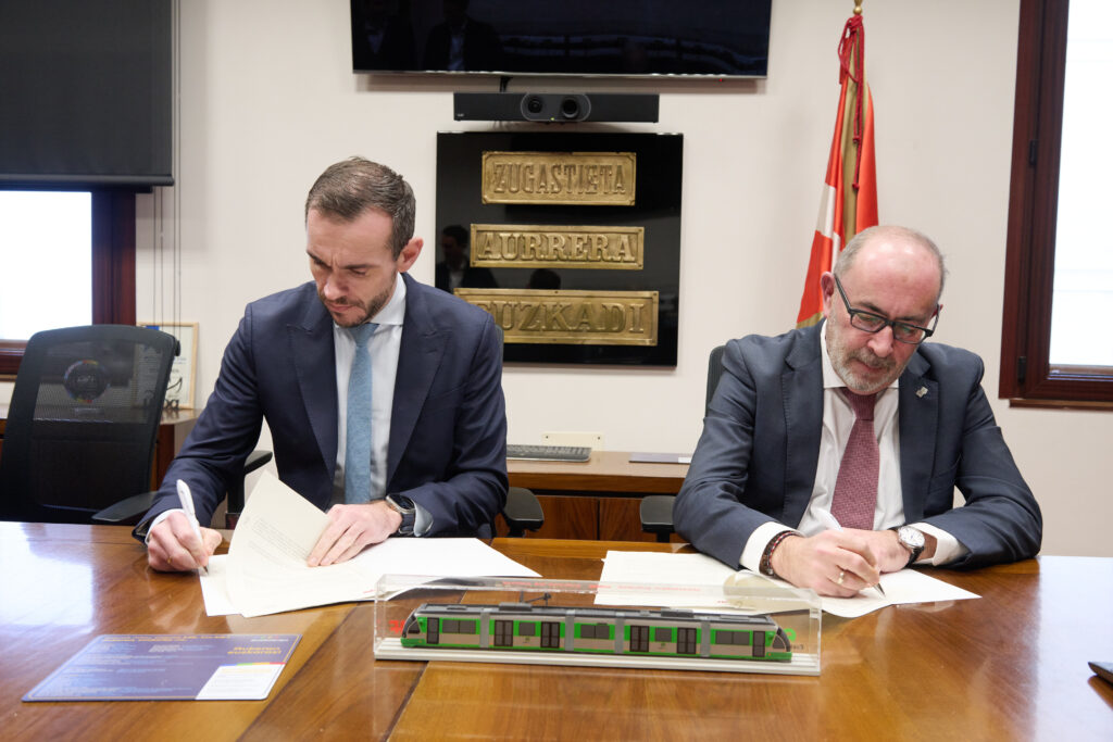 La Sociedad Pública Euskotren y CAF formalizaron ayer el contrato para la fabricación de nueve tranvías extralargos destinados al servicio del proyectado ramal de Zabalgana del tranvía de Vitoria-Gasteiz. El acuerdo, firmado por Javier Seoane y Javier Iriarte, directores generales de ambas compañías, contempla una inversión total de 48.801.000 euros. Las entregas se realizarán de forma escalonada entre 2028 y 2029.