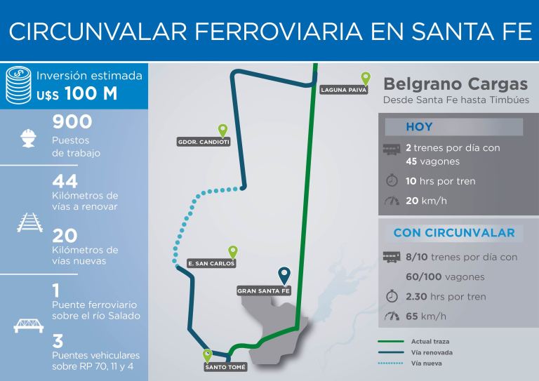 El ministro de Transporte de la Nación, Mario Meoni, ratificó que el proyecto para que los trenes del Belgrano Cargas circunvalen Santa Fe tendrá financiamiento de capitales chinos, estimó que a fines de agosto se firmará el acuerdo respectivo que evitará el ingreso a esta capital de las formaciones que bajan desde el norte del país y tienen como destino los puertos del sur santafesino. Pero además señaló que tienen a estudio con el gobierno provincial la reanudación del sistema ferroviario de pasajeros entre Laguna Paiva y Santa Fe.