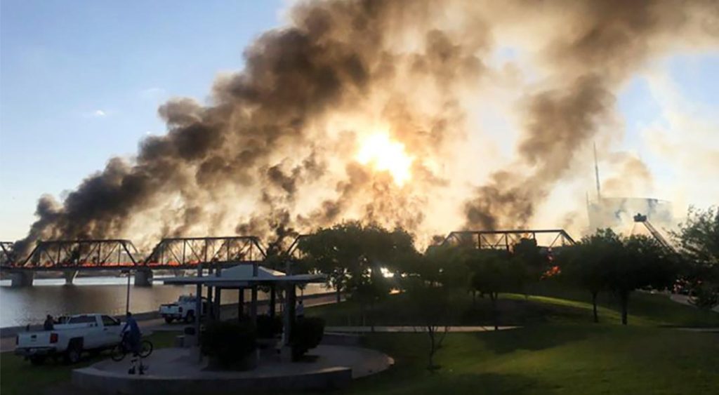 EE.UU – 30/07/2020: Un tren de carga se descarriló este miércoles a lo largo de un puente sobre el lago Tempe Town, cerca de Phoenix (Arizona), en Estados Unidos, y provocó un importante incendio en el lugar.