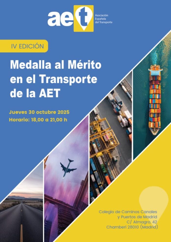 La Asociación Española del Transporte (AET) celebrará la cuarta edición de las Medallas al Mérito en el Transporte el 30 de octubre a las 18:00 horas. El acto tendrá lugar en el Colegio de Caminos Canales y Puertos, situado en la calle Almagro 42 de Madrid, y será retransmitido mediante streaming para quienes no puedan asistir presencialmente.