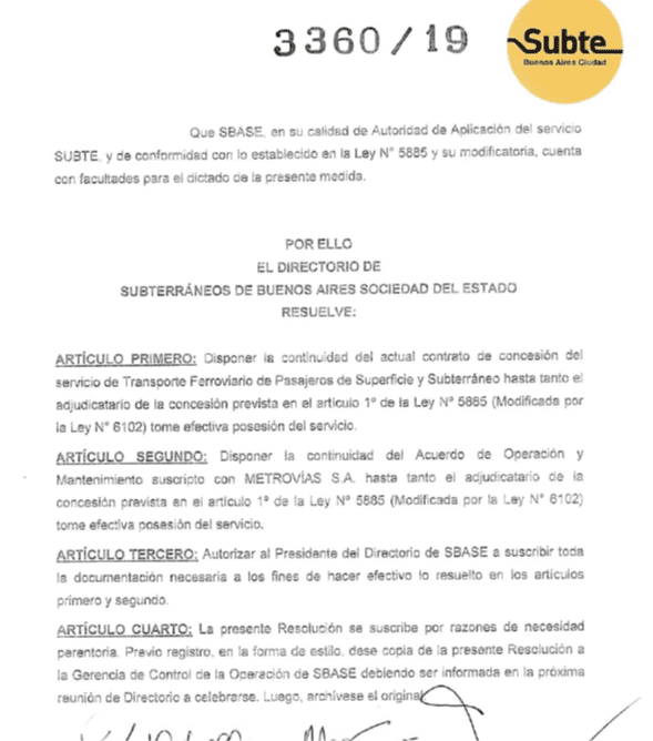 La resolución del directorio de Sbase que prorroga el contrato de Metrovías.