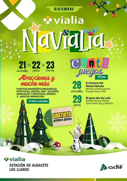 Albacete – 16/12/2022: La estación de Adif vialia ALBACETE LOS LLANOS ha programado diversas actividades para público familiar de carácter gratuito durante las fiestas navideñas, bajo el título de ‘Navialia’, destacando especialmente dos espectáculos musicales infantiles ‘Cantajuegos’, que se celebrarán en la primera planta del centro comercial.