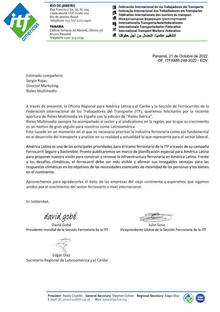 Málaga – 25/10/2022: La Federación Internacional de los Trabajadores del Transporte nos ha enviado una nota oficial con motivo del lanzamiento de nuestra publicación Rieles Ibérica. Compartimos la misma y aprovechamos para saludar a la ITF y ratificar nuestro compromiso de difundir y colaborar con todas las instituciones/sindicatos y federaciones que nuclean a los trabajadores ferroviarios.