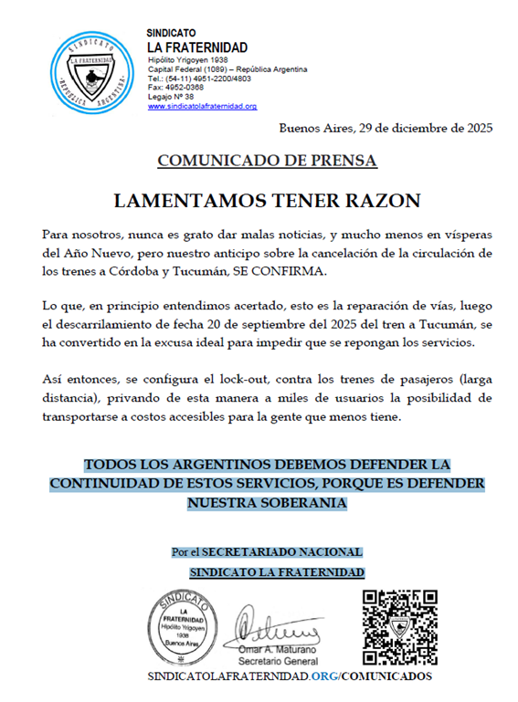 29/12/2025: De acuerdo a un comunicado del Sindicato La Fraternidad, se confirma la cancelación de los servicios de pasajeros de Larga Distancia Buenos Aires – Tucumán y Buenos Aires – Córdoba.