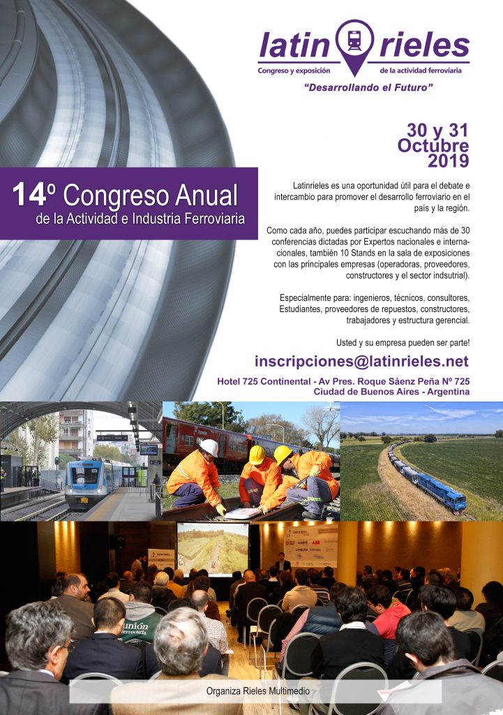 Buenos Aires – Argentina – 22/07/2019: En el día de la fecha hemos lanzado oficialmente una nueva edición del 14° Congreso de la Actividad e Industria Ferroviaria «Latinrieles 2019 – Desarrollando el Futuro». Esta nueva edición se desarrollara el próximo 30 y 31 de octubre en el Hotel Continental 725 de la CABA. Para más información: info@rieles.com o info@latinrieles.net.