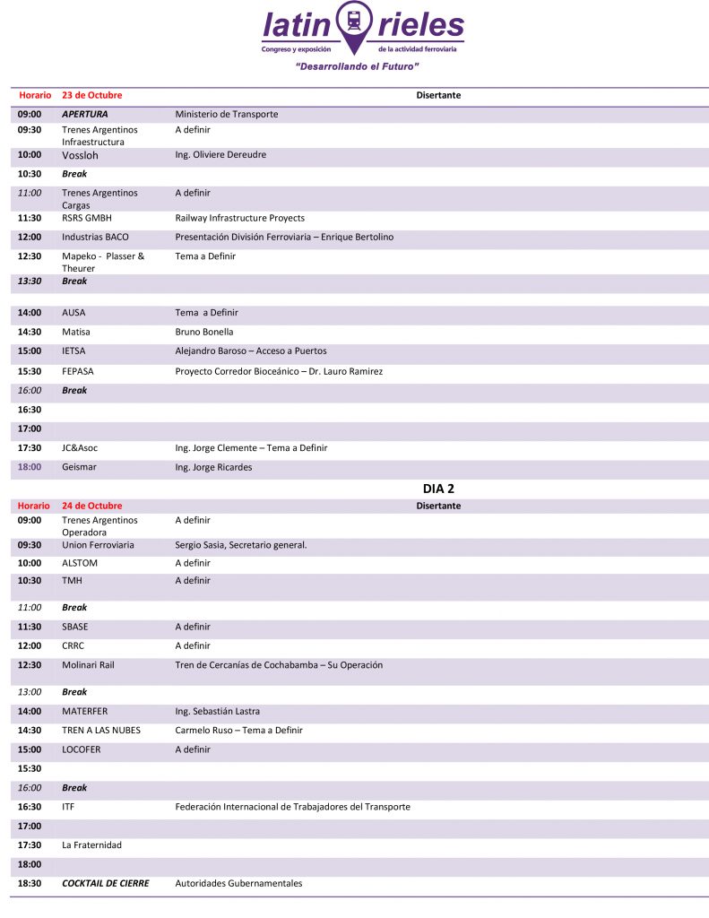 Buenos Aires – Argentina – 29/08/2019: En el día de la fecha la organización del 14° Congreso de la Actividad e Industria Ferroviaria «Latinrieles», informo sobre el primer programa de expositores.
