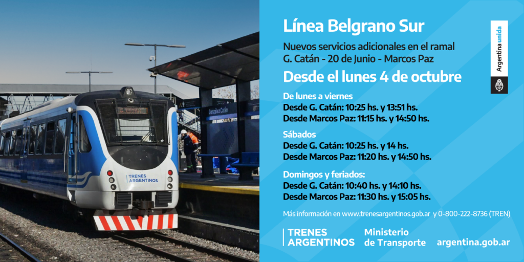 Los sábados, partirán a las 10:25 y 14:00 hacía Marcos Paz y a las 11:20 y 14:50 de esta parada ferroviaria; por último, los domingos habrá servicios a las 10:40 y 14:10 desde Catán y a las 11:30 y 15:05 desde Marcos Paz.