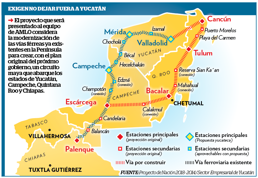 Luego de que EL EXPRESO publicara que una de las siete obras de infraestructura más importantes del próximo sexenio de Andrés Manuel López Obrador sería el Tren Maya, mismo que atravesaría todo el Sur de la entidad al conectar con Cancún, Quintana Roo y con Palenque, Chiapas, el sector empresarial de Yucatán propuso una ruta alterna, la cual beneficiaría a la capital campechana.