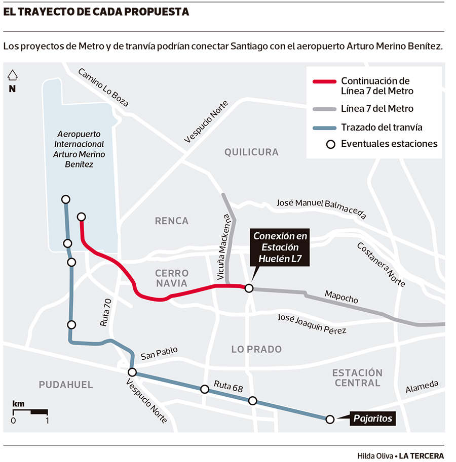 La autoridad detalla que de las dos iniciativas en carpeta, la ampliación de Metro abarcaría 6,5 kilómetros de extensión, que comenzarían en la futura estación Huelén de Línea 7, en Cerro Navia. El objetivo del MOP es que el servicio al aeropuerto sea “independiente”, por lo que la construcción y operación serán realizadas por un privado que se adjudique las obras.