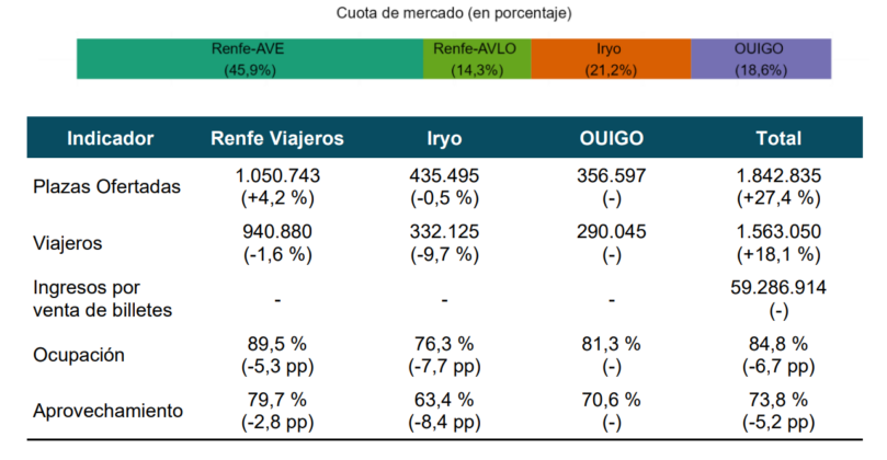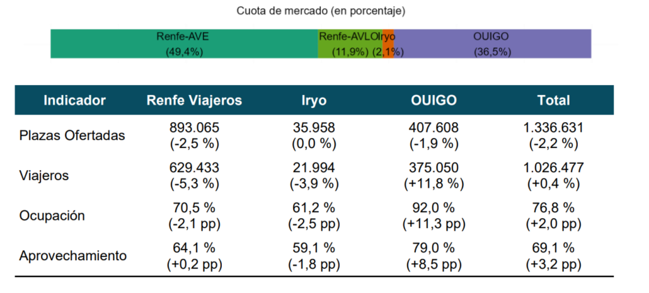 La distribución de cuotas entre operadores mostró variaciones en cada corredor. Renfe conservó posiciones mayoritarias salvo en dos tramos de fuerte competencia, donde Ouigo e Iryo ampliaron su presencia: Madrid-Alicante y Madrid-Sevilla. En paralelo, los precios medios evidenciaron incrementos y descensos según la ruta, siempre comparados con etapas previas y con valores anteriores a la liberalización.