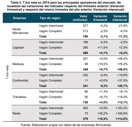 En los servicios de media distancia y Cercanías, los movimientos fueron moderados, con variaciones asociadas a esquemas de abonos subvencionados. La intermodalidad también registró actividad creciente en el tráfico de mercancías, reflejada en más toneladas.km netas. En este segmento, varios operadores reforzaron su participación y ajustaron su oferta para mejorar la seguridad operacional y optimizar la gestión del material rodante en ruta.