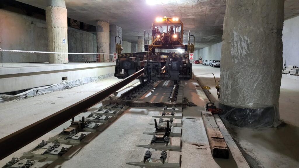 En la planta inferior, se han ejecutado los andenes y se avanza en el montaje de vía con maquinaria especializada, como los trenes carrileros. De los 13,4 km de nueva vía, 6,1 km corresponden a las 8 vías de la estación, 5 de ancho estándar (3,1 km) y 3 de ancho mixto (3 km), que darán servicio tanto a las circulaciones de alta velocidad como de Cercanías y Regionales. En el pasillo ferroviario se montarán 7,3 km, que corresponden a una vía de ancho estándar y otra de ancho mixto.