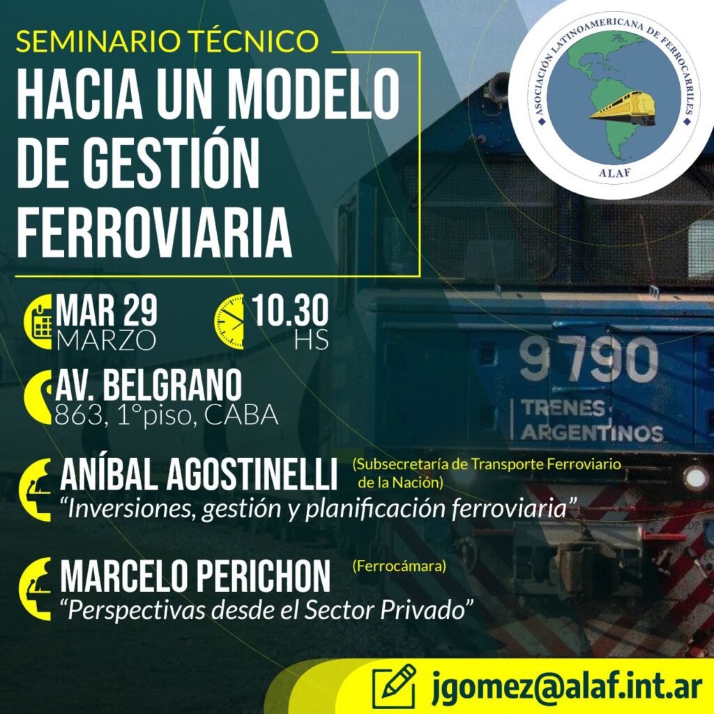 Buenos Aires – Argentina – 25/03/2022: El próximo martes 29 de marzo se desarrollara en ALAF el seminario técnico «Hacia un Modelo de Gestión Ferroviaria». El mismo tendrá lugar en la sede de ALAF, sita en Av. Belgrano 863 – 1er. Piso, para más información: jgomez@alaf.int.ar