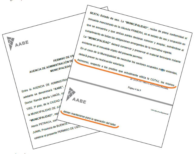 En la cláusula sexta del documento, al que tuvo acceso Democracia, se dispone que “respecto a los predios que actualmente utiliza la COTAJ (sic), los mismos deben mantenerse para la operación del taller”. En cuanto a las obligaciones de la municipalidad sobre los terrenos cedidos, el mismo artículo también define que se “deberá conservar y preservar el material ferroviario rodante existente en el inmueble objeto del presente permiso”.
