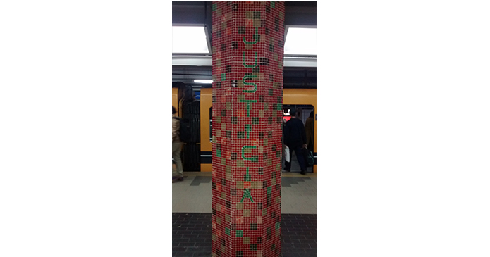 Dicha intervención consiste en que las mismas están siendo revestidas con venecitas de distintos colores, y entre ellas, en forma vertical se dejan ver palabras como: CONVIVENCIA, SOLIDARIDAD, JUSTICIA, INCLUSION, IDENTIDAD, Y DIVERSIDAD.
