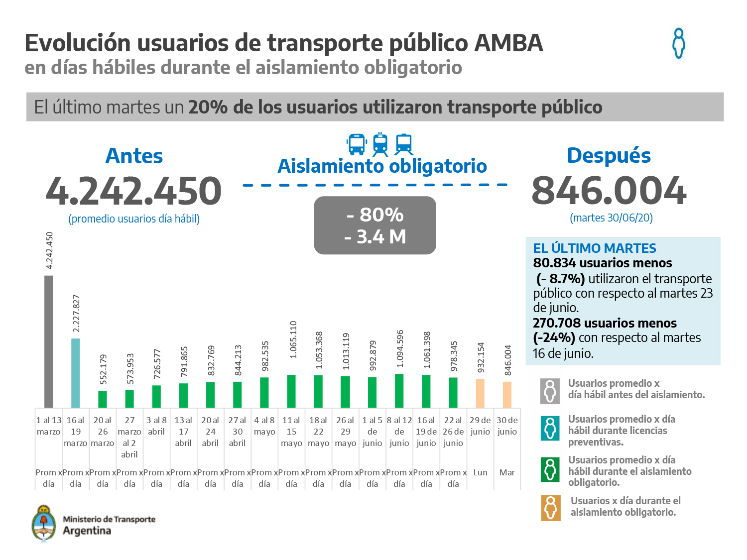 Las cifras, obtenidas a través de un relevamiento de datos enviado por SUBE, indican que los 846.004 de pasajeros de ayer representan una reducción del 80 % frente a los 4.242.450 pasajeros que utilizaron los 3 medios de transporte, en promedio, en días hábiles previos al aislamiento. Además de reflejar una disminución del 8,7 % frente a la circulación del martes pasado, si se lo compara con la cantidad de pasajeros que utilizaron el transporte público el martes 16 de junio, la cifra de ayer arroja una reducción del 24 % (270.708 usuarios menos) en comparación con el martes 16 de junio.