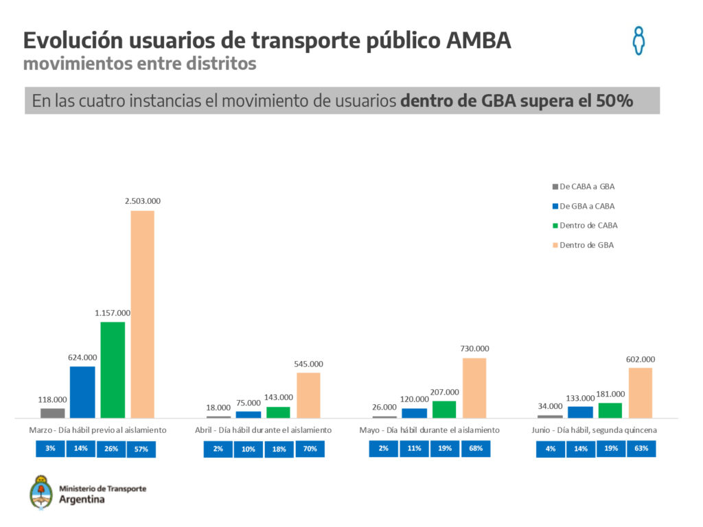 Durante la segunda quincena de junio, un 63 % de los pasajeros viajó dentro del Gran Buenos Aires; un 19 % lo hizo dentro de la Ciudad; un 14 %, desde la Provincia hacia la Ciudad; y un 4%, desde CABA hacia PBA.