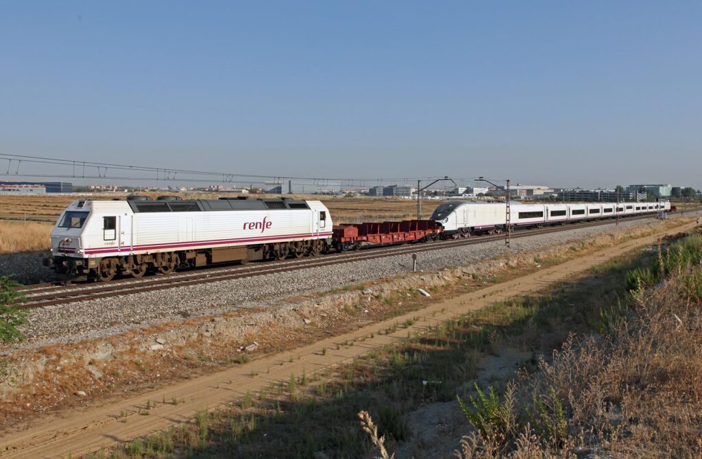 Madrid – España – 30/07/2020: El primer tren de alta velocidad Avril producido en serie, ordenado por RENFE, salió de la fábrica de Talgo en Rivabellosa durante la noche del 23 al 24 de julio para ser trasladado al depósito de La Sagra al norte de Toledo para realizar pruebas en la red de alta velocidad. El tren fue arrastrado por los suburbios de Madrid con sus bogies de calibre 1 435 mm montados en patines de ruedas de calibre 1 668 mm.