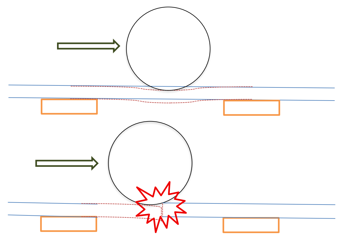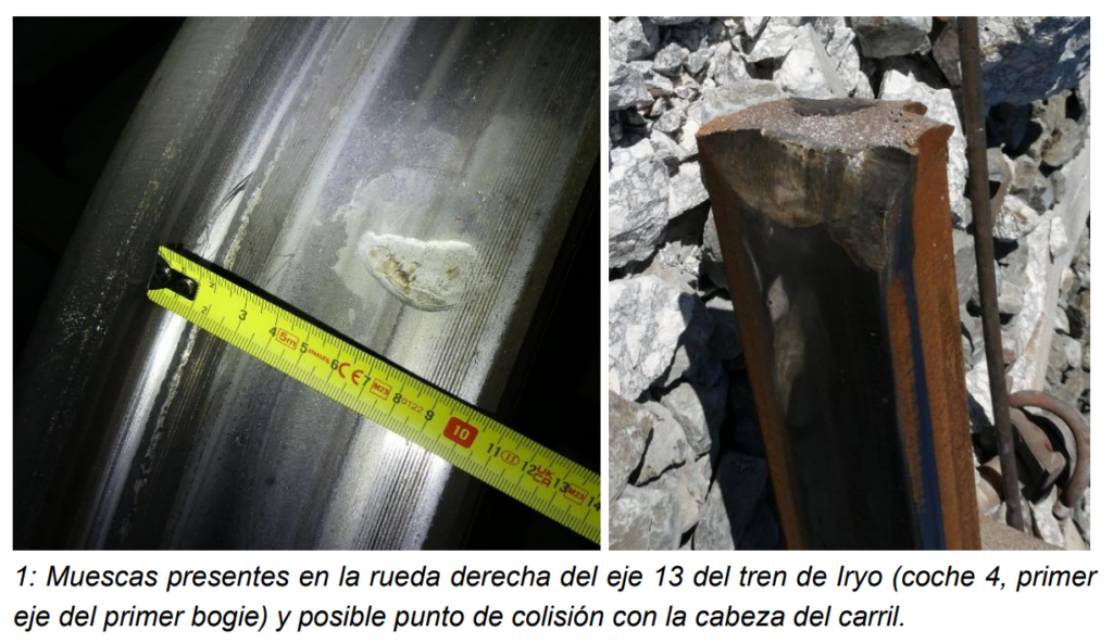 «Estas muescas consisten en una marca en la zona exterior de la banda de rodadura, compatible con un impacto contra la cabeza de carril en una posición de no continuidad con la zona previa a la fractura. El hecho de que estas muescas se encuentren en el coche 5, y que el coche 6 fuese el primero descarrilado de la composición es compatible con que el carril se estuviese volcando hacia el exterior (lado derecho según el sentido de avance) durante el paso del coche 5, de manera que el coche 6 descarriló debido a una falta completa de continuidad en la rodadura». (extracto del informe)