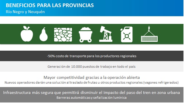 Con el nuevo sistema de operación más las inversiones, se proyecta quintuplicar el potencial de carga del sistema ferroviario para 2031: en 2015, en uno de sus puntos históricos más bajos, el tren de cargas transportó 18,4 millones de toneladas, y en los próximos años se proyecta llevar la capacidad del sistema a 97,9 millones, incrementando de esta manera no sólo la cantidad de carga en toneladas sino además la variedad de productos y las condiciones operativas para ampliar el volumen, beneficiando tanto a la agroindustria como la construcción, los productos con origen y destino Vaca Muerta, y las cargas en general.