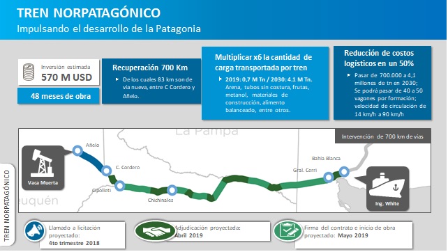 Con una inversión de 570 millones de dólares, se recuperarán 700 kilómetros de vías entre Bahía Blanca y Añelo, en la provincia de Neuquén, a través del sistema de participación público-privada (PPP), para impulsar el desarrollo de Vaca Muerta y la sustentabilidad energética, y también el crecimiento de las economías regionales con la reducción a la mitad de los costos logísticos más la creación de 10.000 puestos de trabajo.