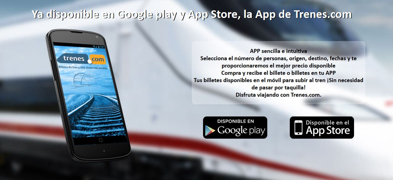 Con las mismas prestaciones que se encuentran en la página web de Trenes.com llega ahora la APP de Trenes.com tanto para Android como para IOS, con la ventaja de no se tiene ni siquiera que imprimir los billetes de tren y los billetes AVE adquiridos a través de la APP, simplemente con enseñar el código Bidi que queda guardado en la APP del usuario, sin necesidad de pasar por taquilla.