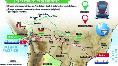El presidente boliviano, Evo Morales, ha destacado varias veces que una obra de ese tipo beneficiará de forma directa e indirecta a seis de los doce países de Suramérica en un proceso de integración regional y ayudará al comercio con China. Se prevé que el ferrocarril comience en Puerto Santos, Brasil; ingrese a Bolivia por Puerto Suárez, pase por los municipios de Santa Cruz, Montero y Bulo Bulo hasta llegar al altiplano de La Paz, para salir a Perú por el hito cuatro y terminar en el Puerto de Ilo. El CFBC -que unirá los océanos Atlántico y Pacífico- demandará hasta el momento una inversión de 10 mil millones de dólares y su construcción demorará de cinco a siete años.